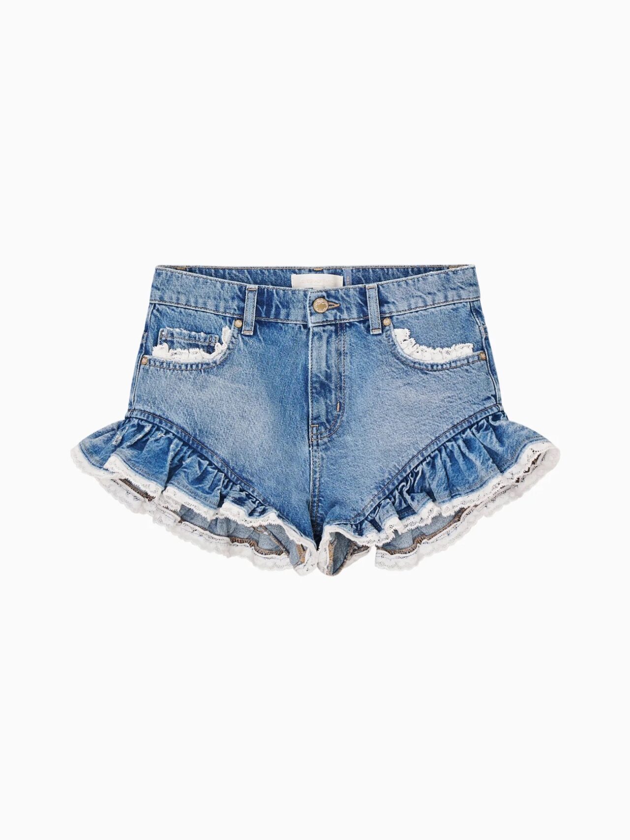 LOVESHACKFANCY-AZALURE DENIM RUFFLE MINI SHORTS