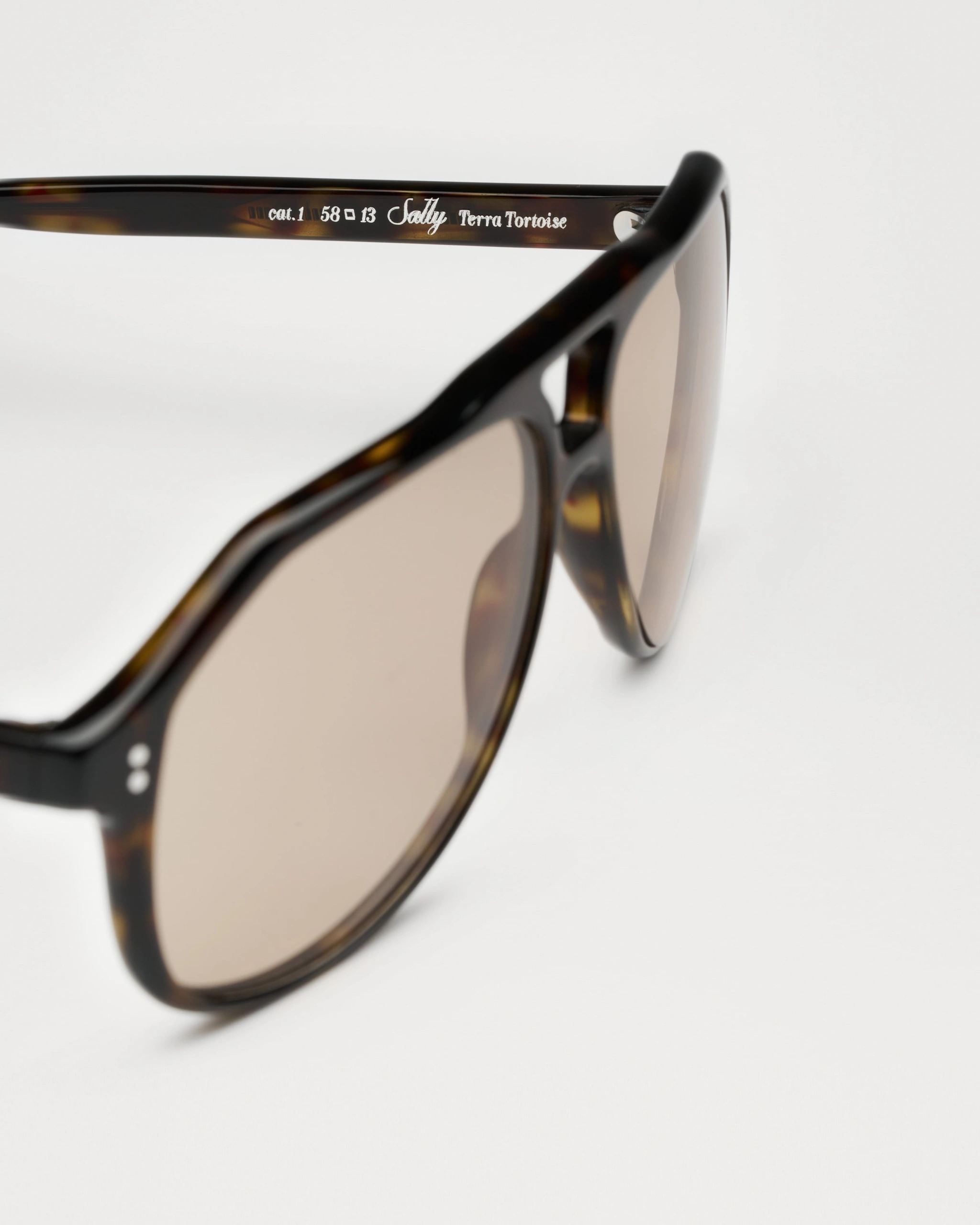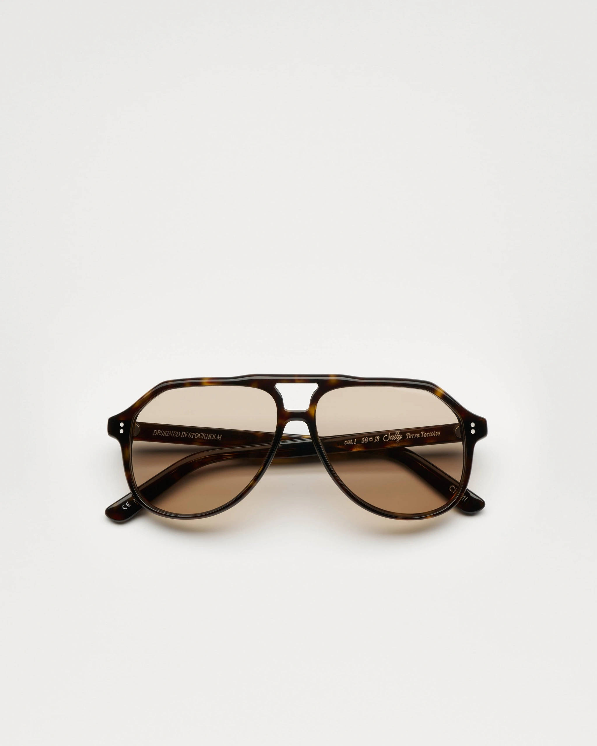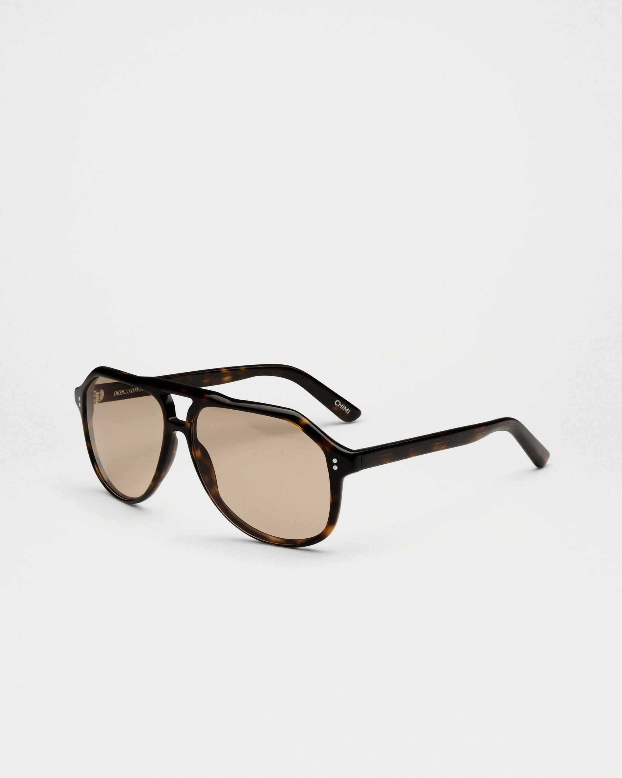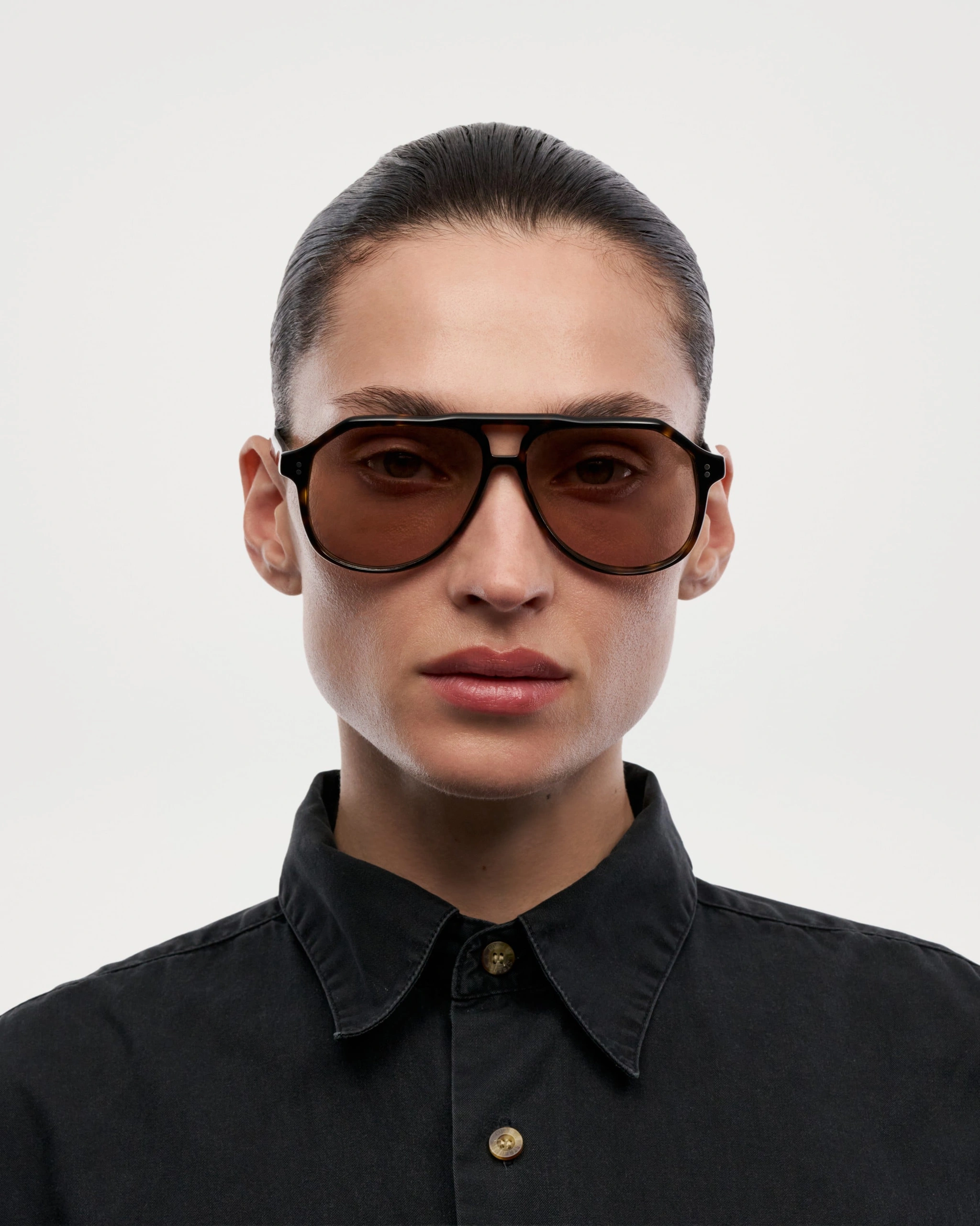 An aviator silhouette with structured contours and arched double bridge. Finished with custom made metal detailing characterized by our signature metal trim.