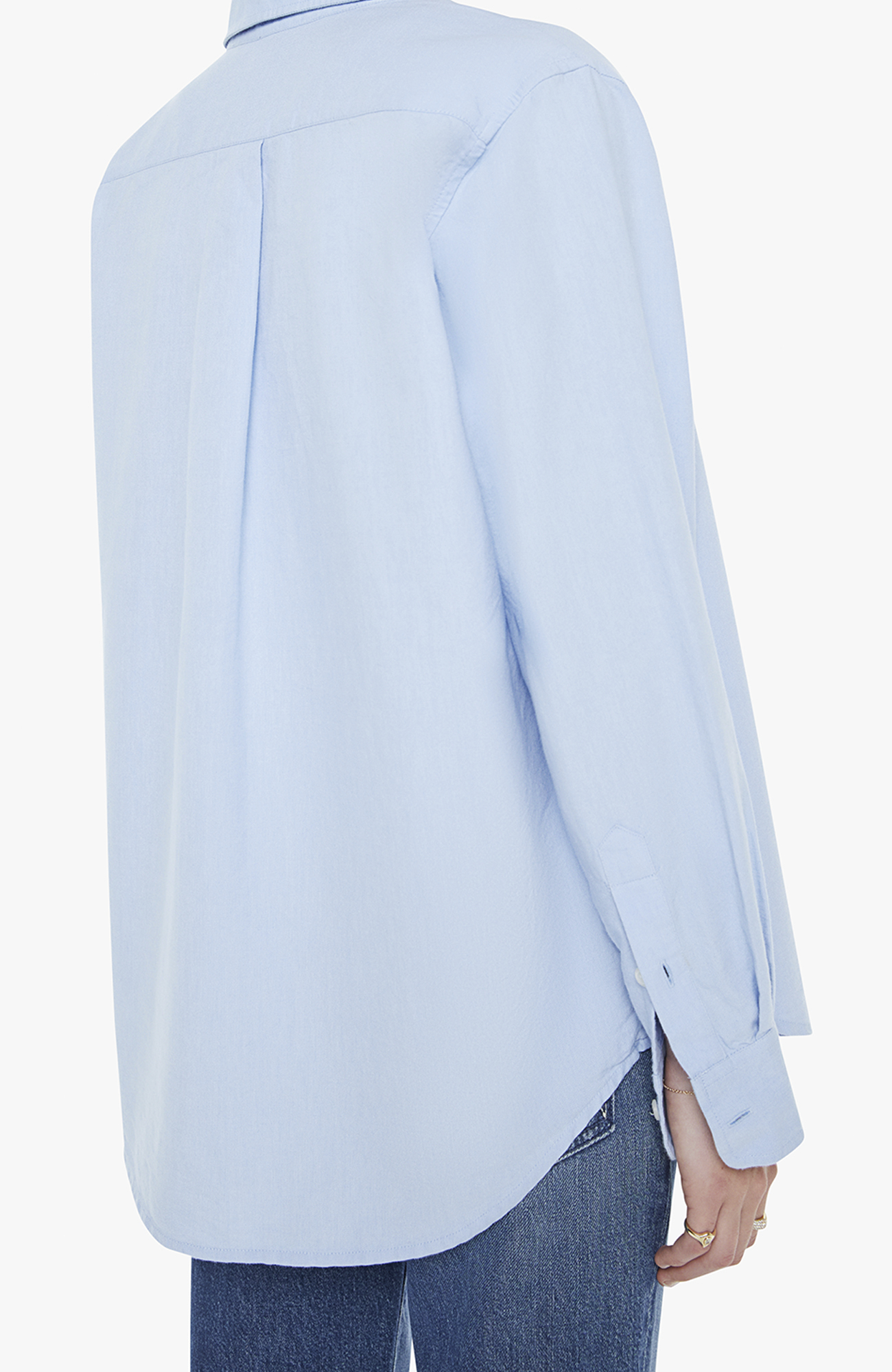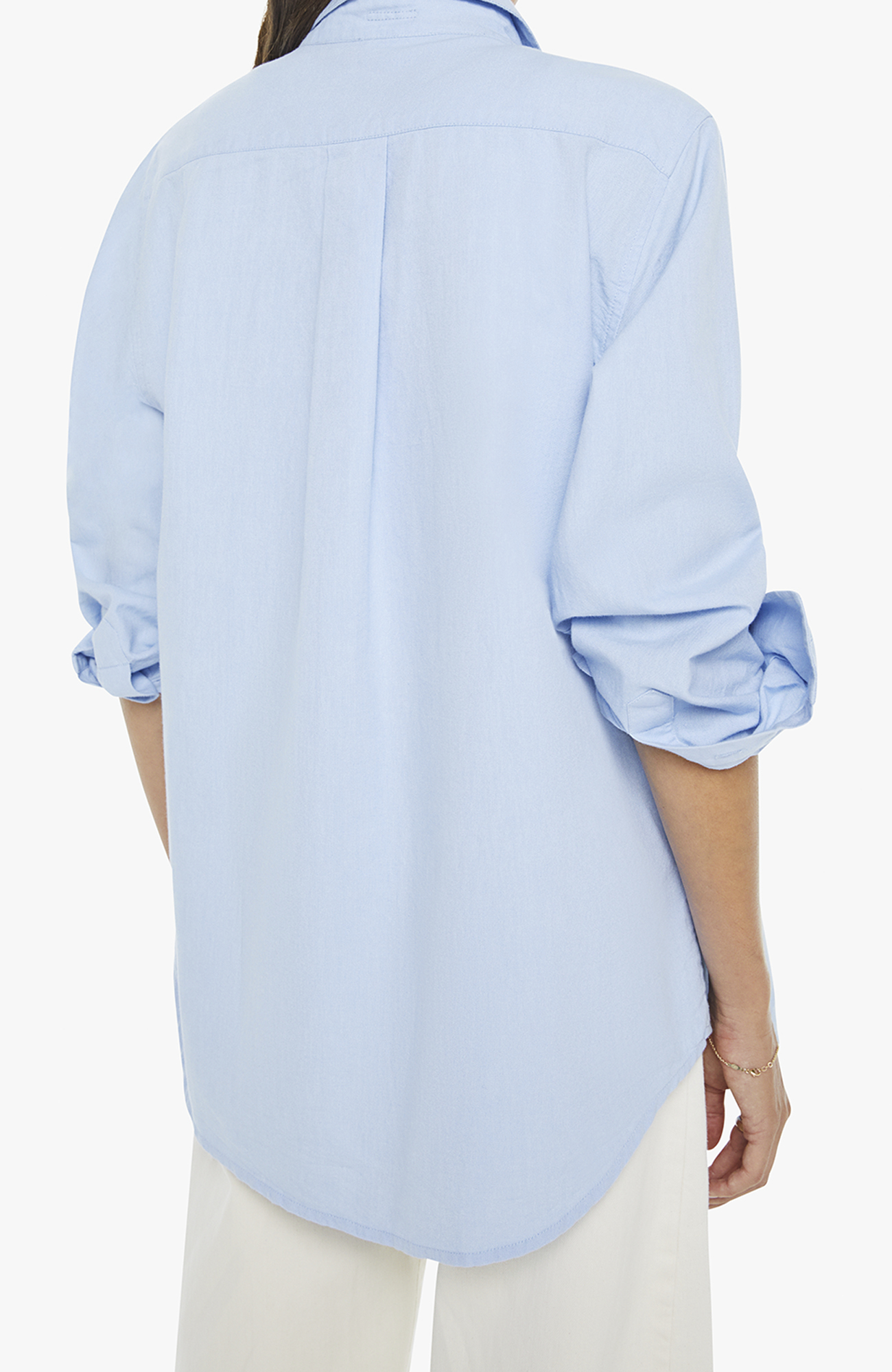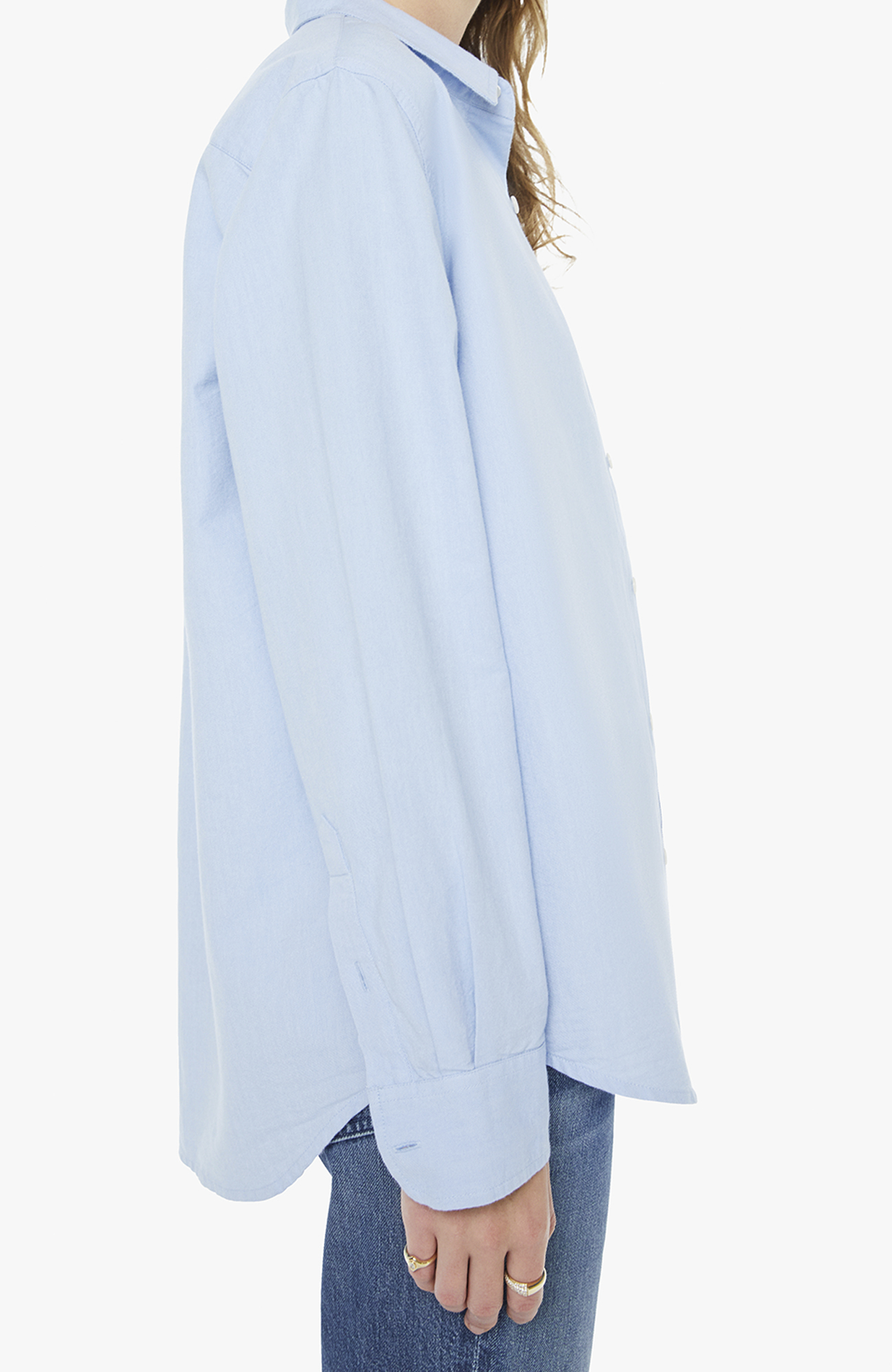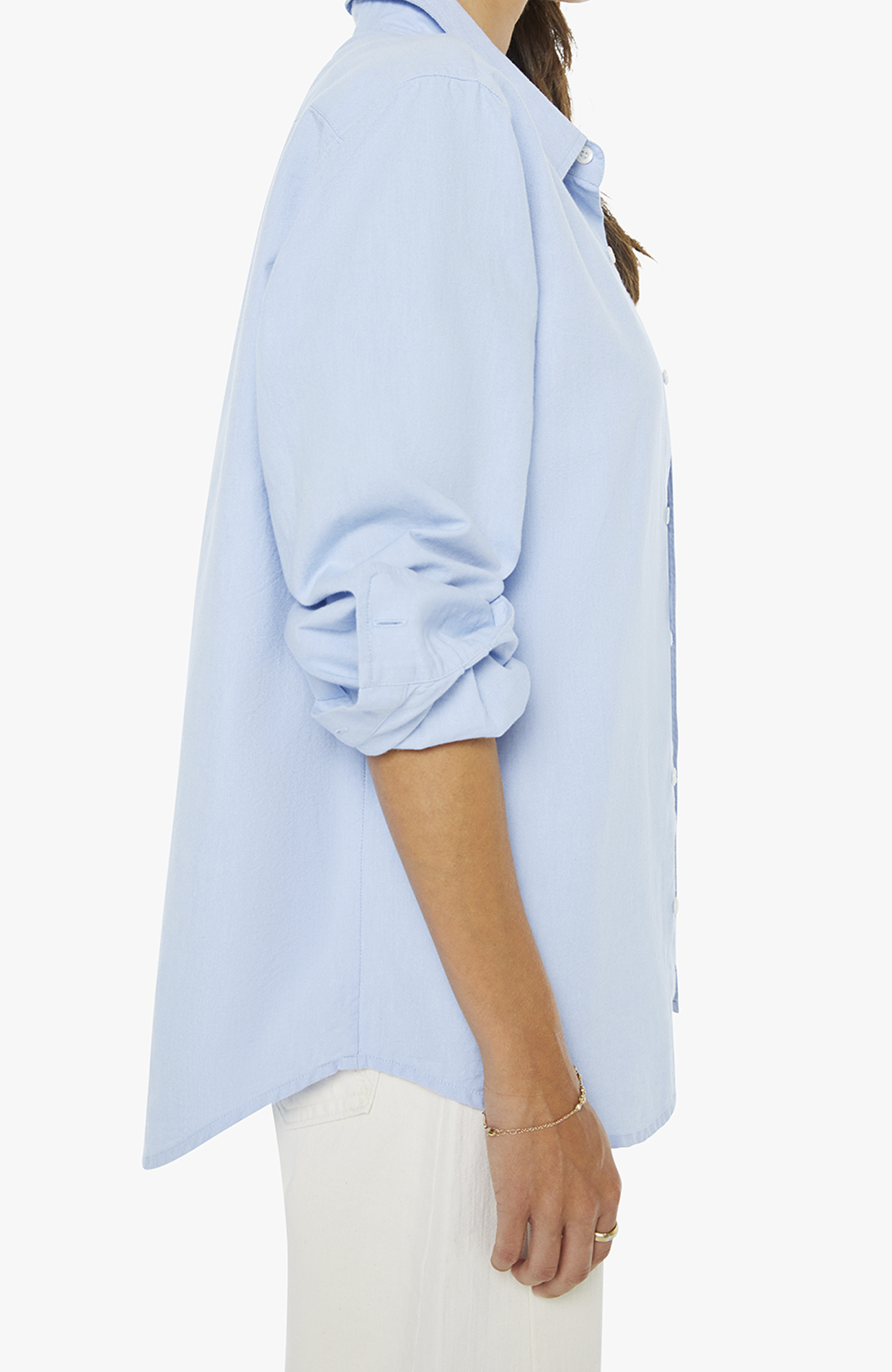 An expanded collection of foundational pieces designed for All Day, Every Day. Created for versatility, layering, and year-round wearability, these are the pieces you will never stop reaching for. A classic button-up with a curved hem and MOTHER's name embroidered on the chest. Made from 100% cotton, The Bestie is designed in light blue.