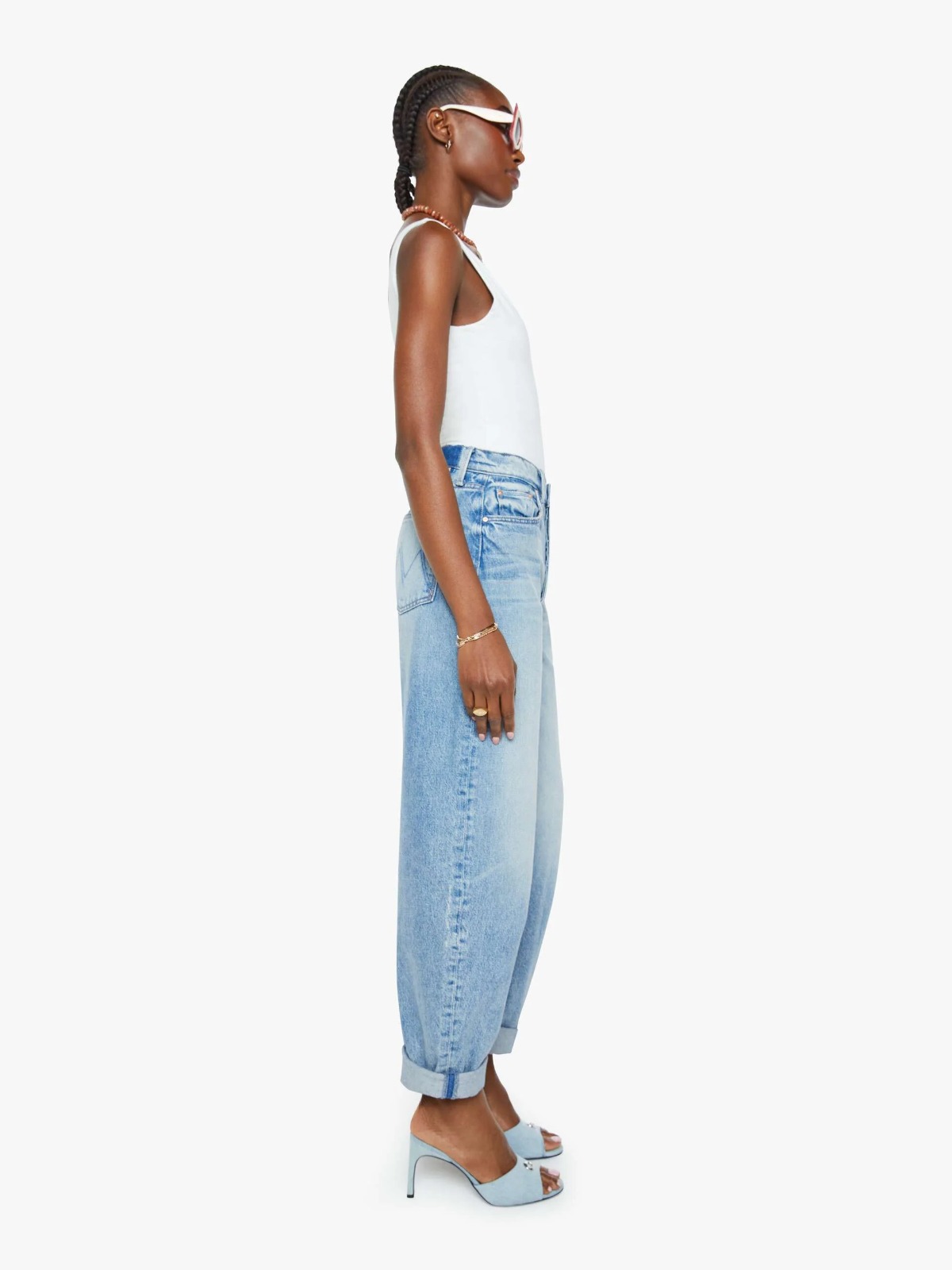 No shade. High-waisted jeans with a wide barrel leg, button fly and a 31-inch inseam with a cuffed hem. Made from rigid SUPERIOR denim, Blinded By The Light is a light blue with whiskering and fading at the knee.
