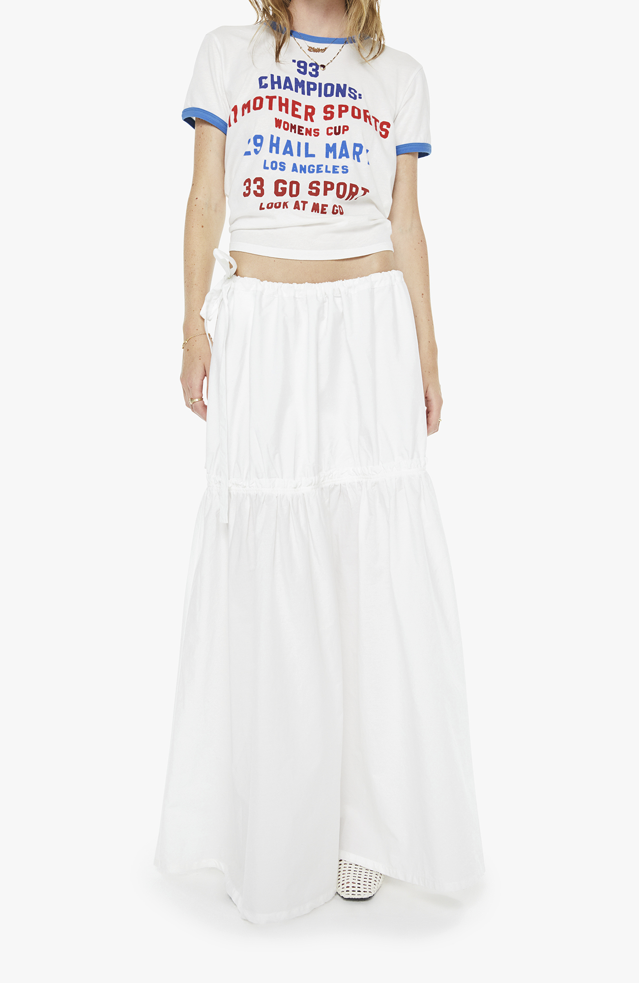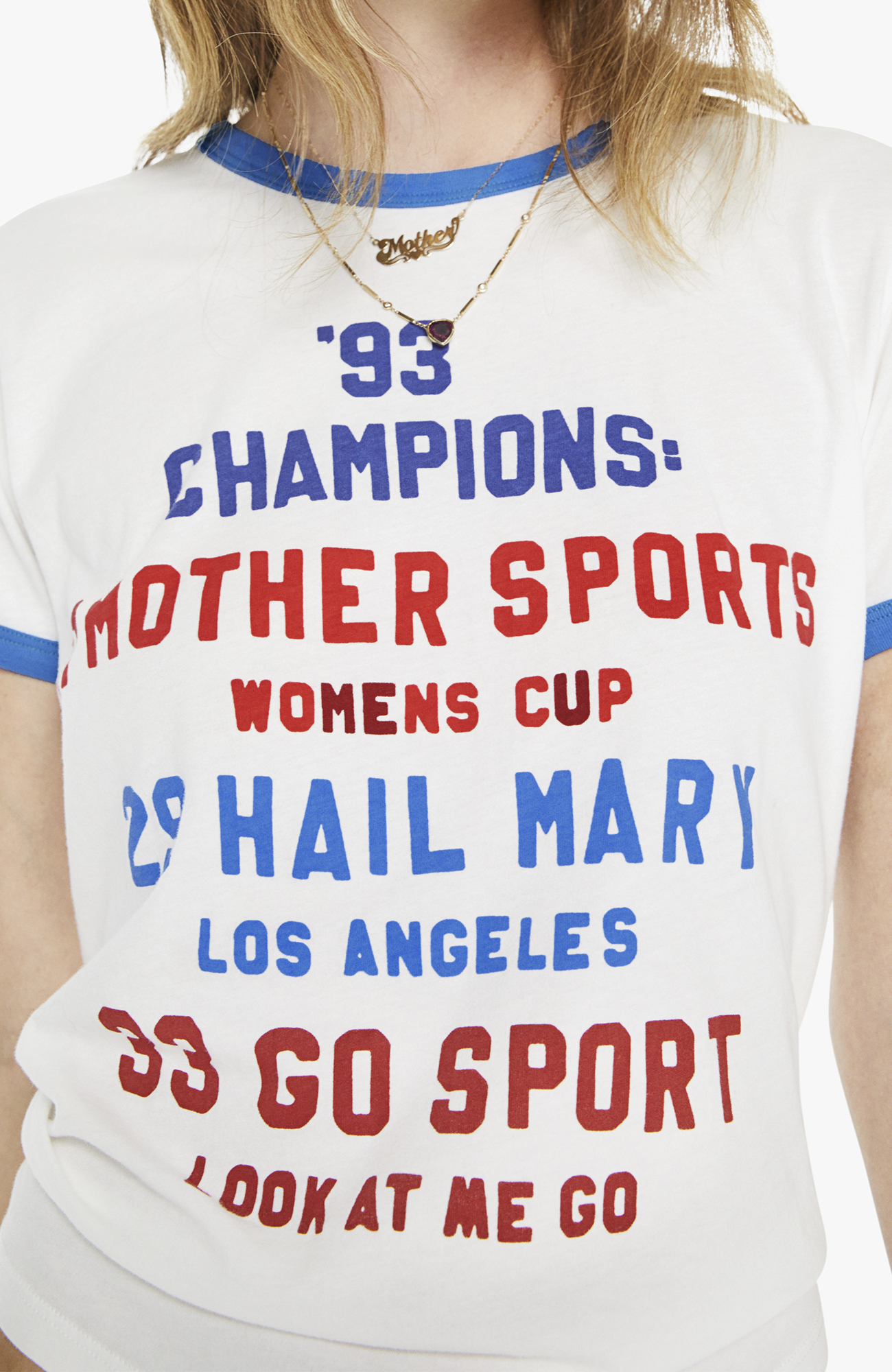 MVP. A crewneck tee with extra-short sleeves and a slightly shrunken fit. Made from 100% supima cotton, Champions is an off-white with light blue trim and a colorful text graphic inspired by a vintage scoreboard on the front.