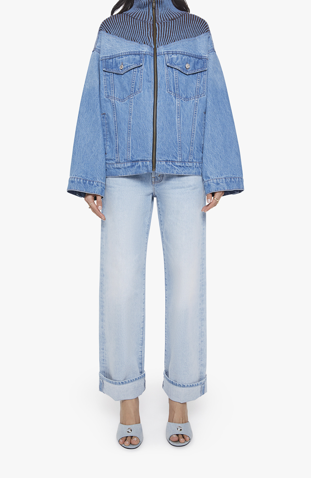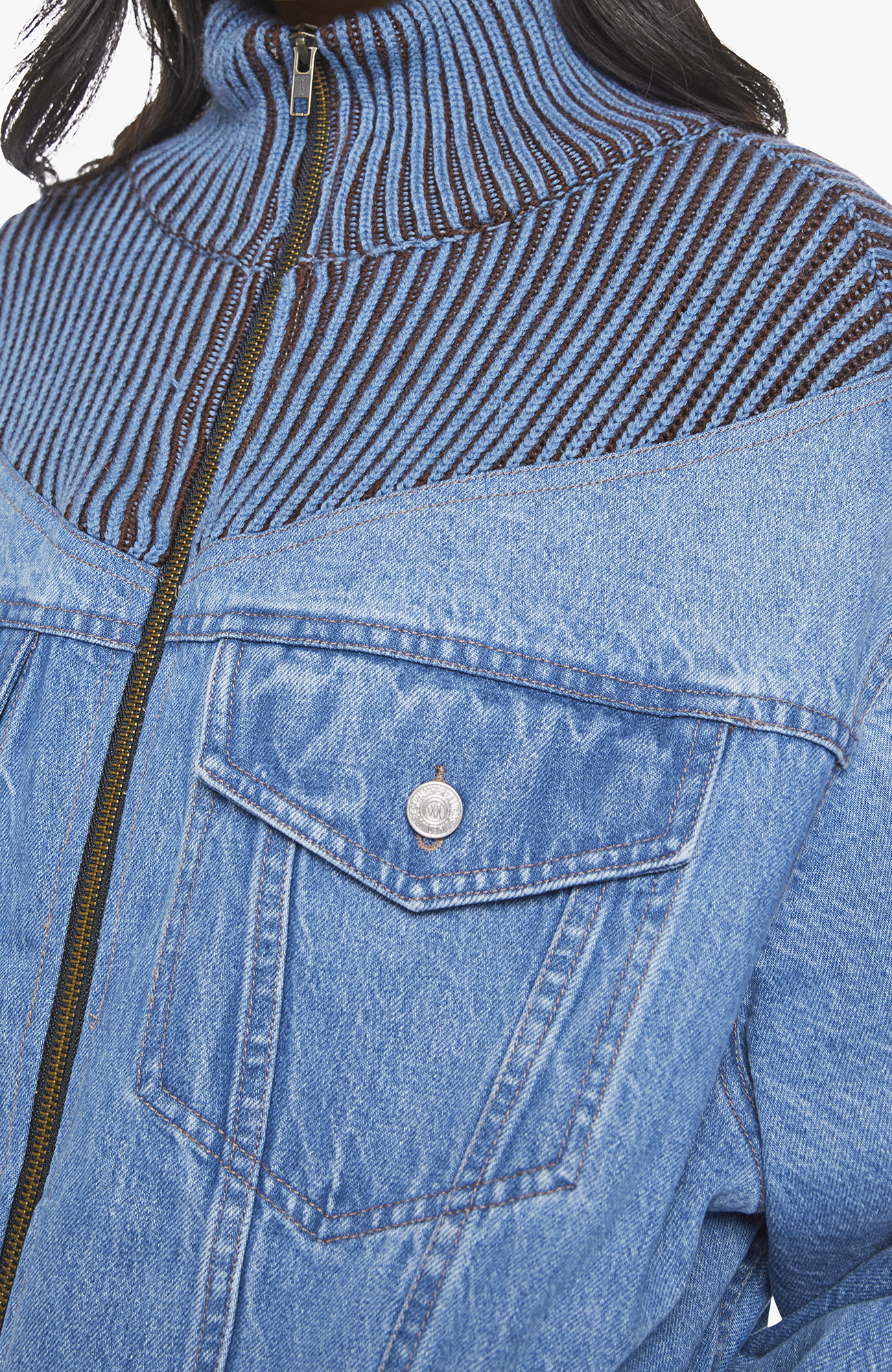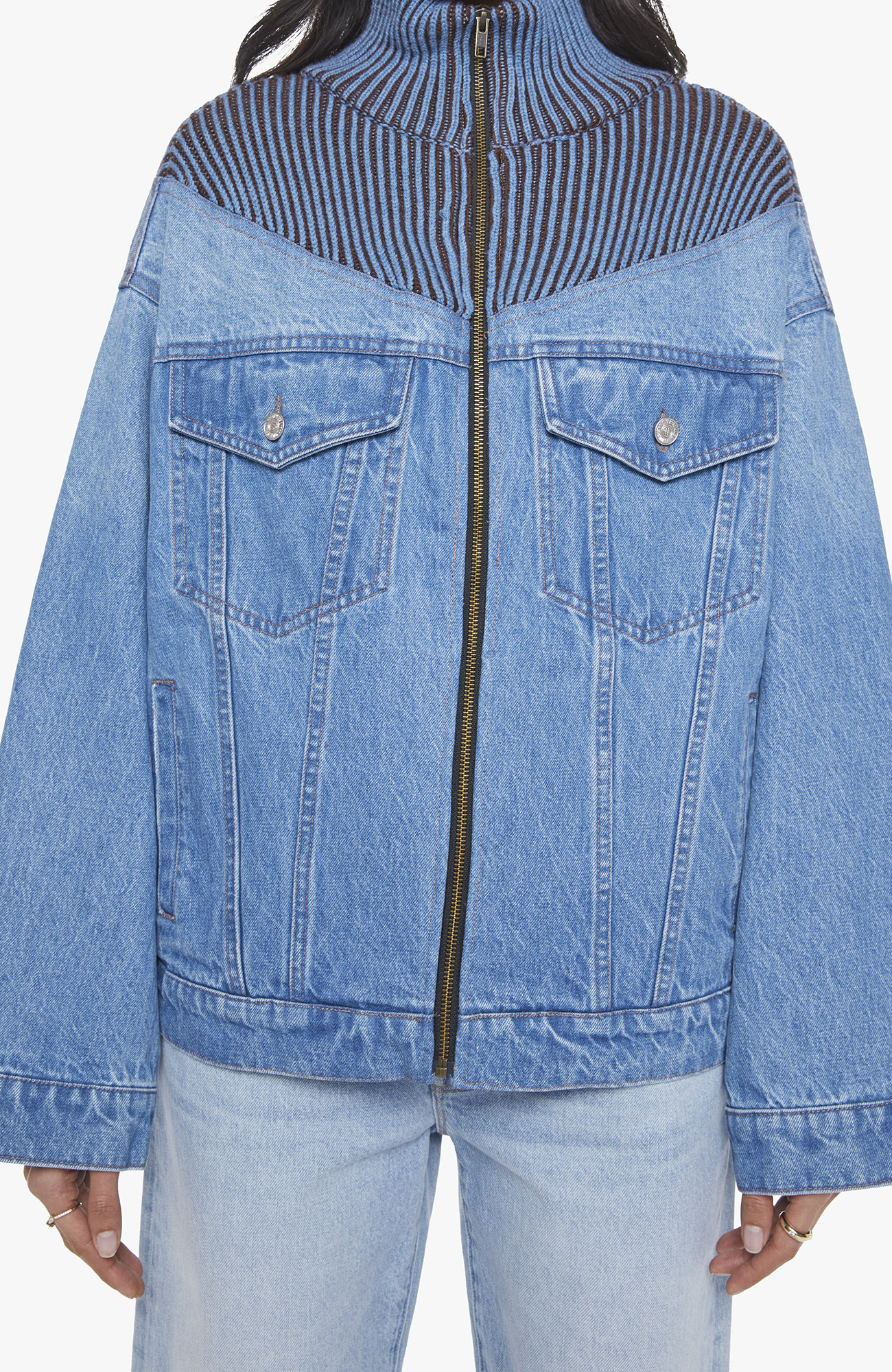 Serve chilled. Half denim jacket, half sweater, the Mixtape is designed with ribbed details around the neck, chest and shoulders, a high collar, drop shoulders, extra-wide long sleeves, front patch pockets and a super boxy fit. Made from rigid 100% cotton, Coldslaw is a faded denim with blue and brown knit fabric around the neck.