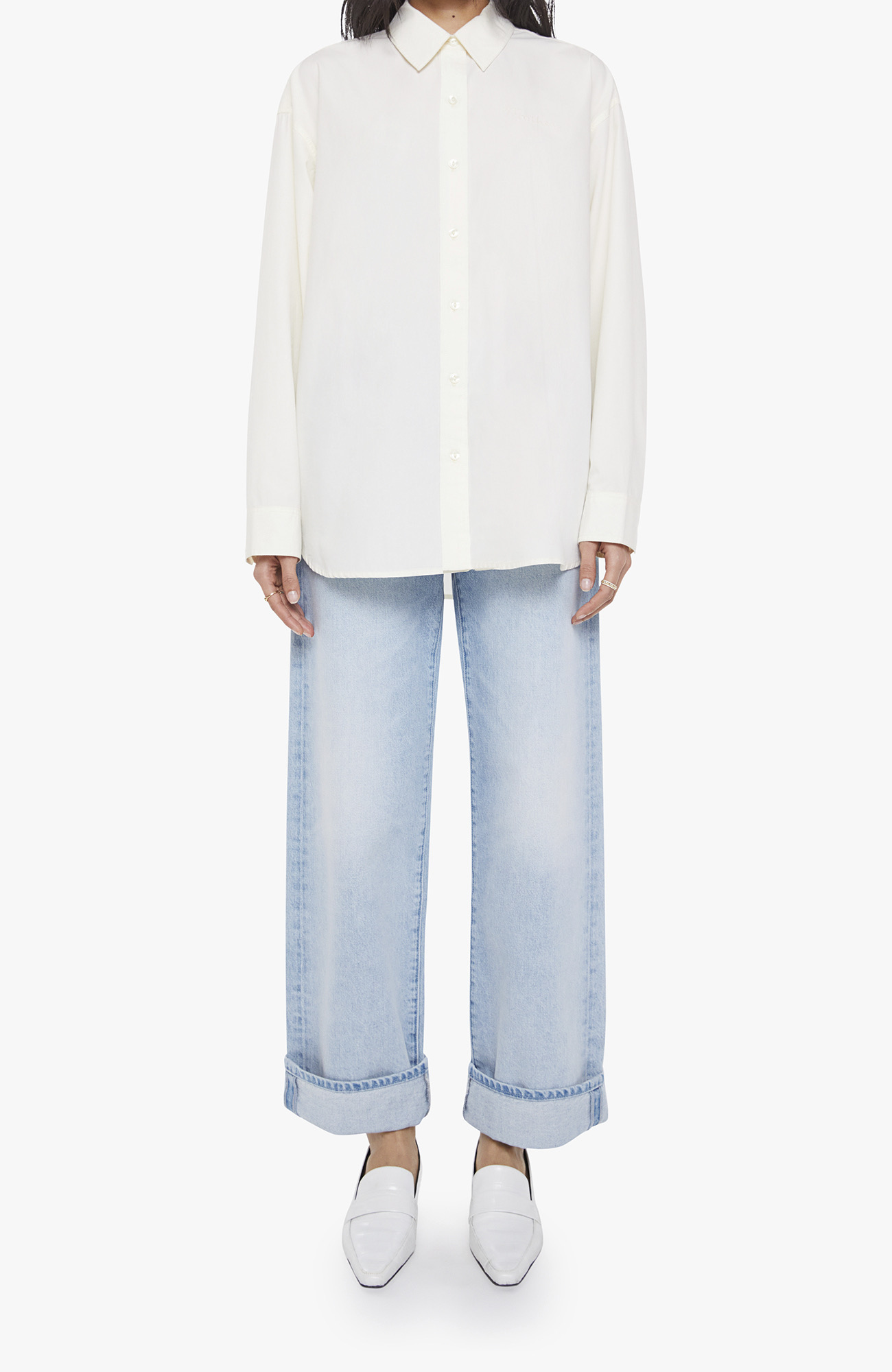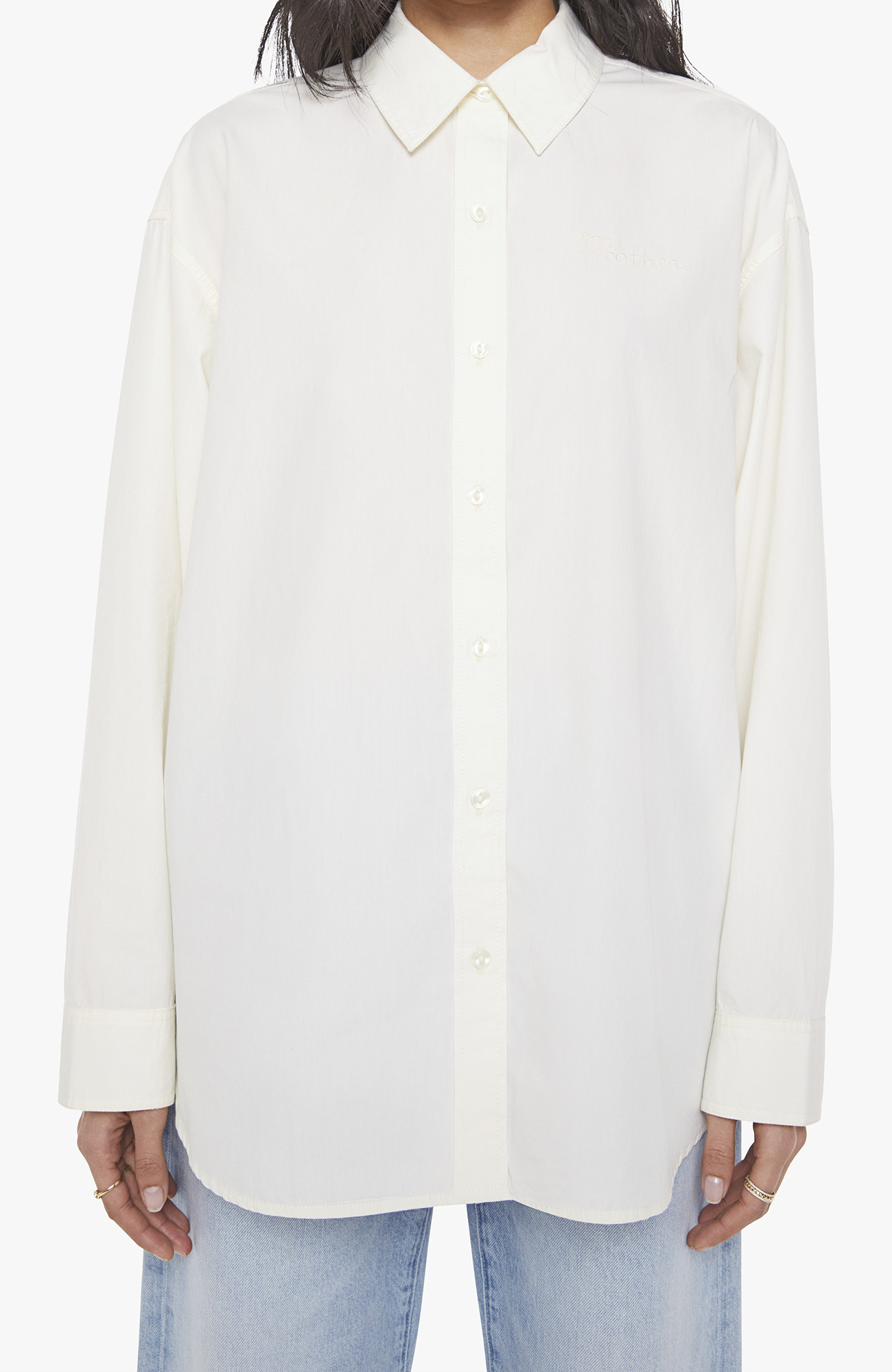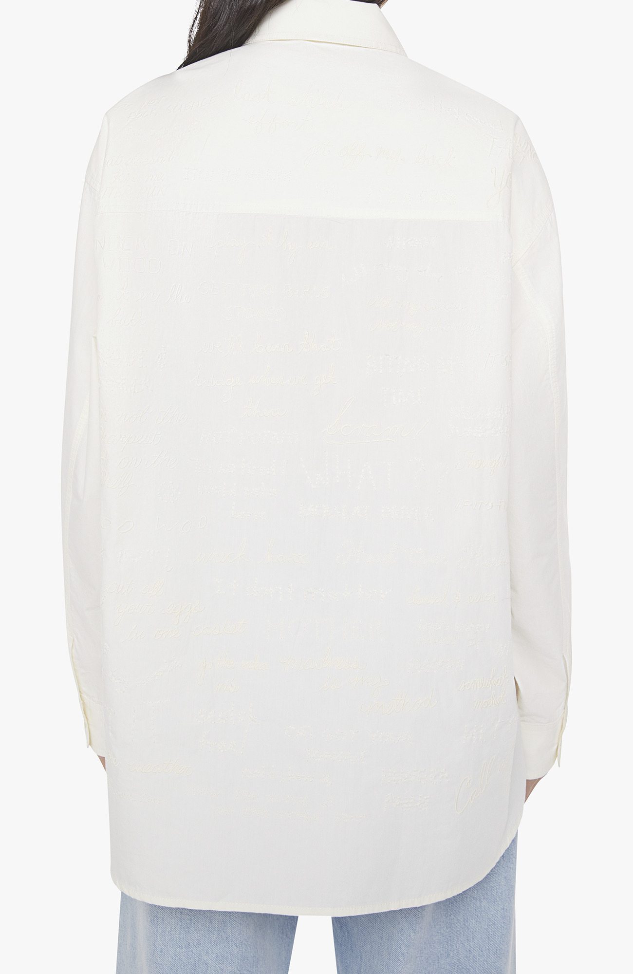 An oversized button-up blouse with drop shoulders and a curved hem. Made from 100% cotton in antique white, the top features chain-stitched and embroidered idioms on the back and MOTHER's name in cursive on the chest.