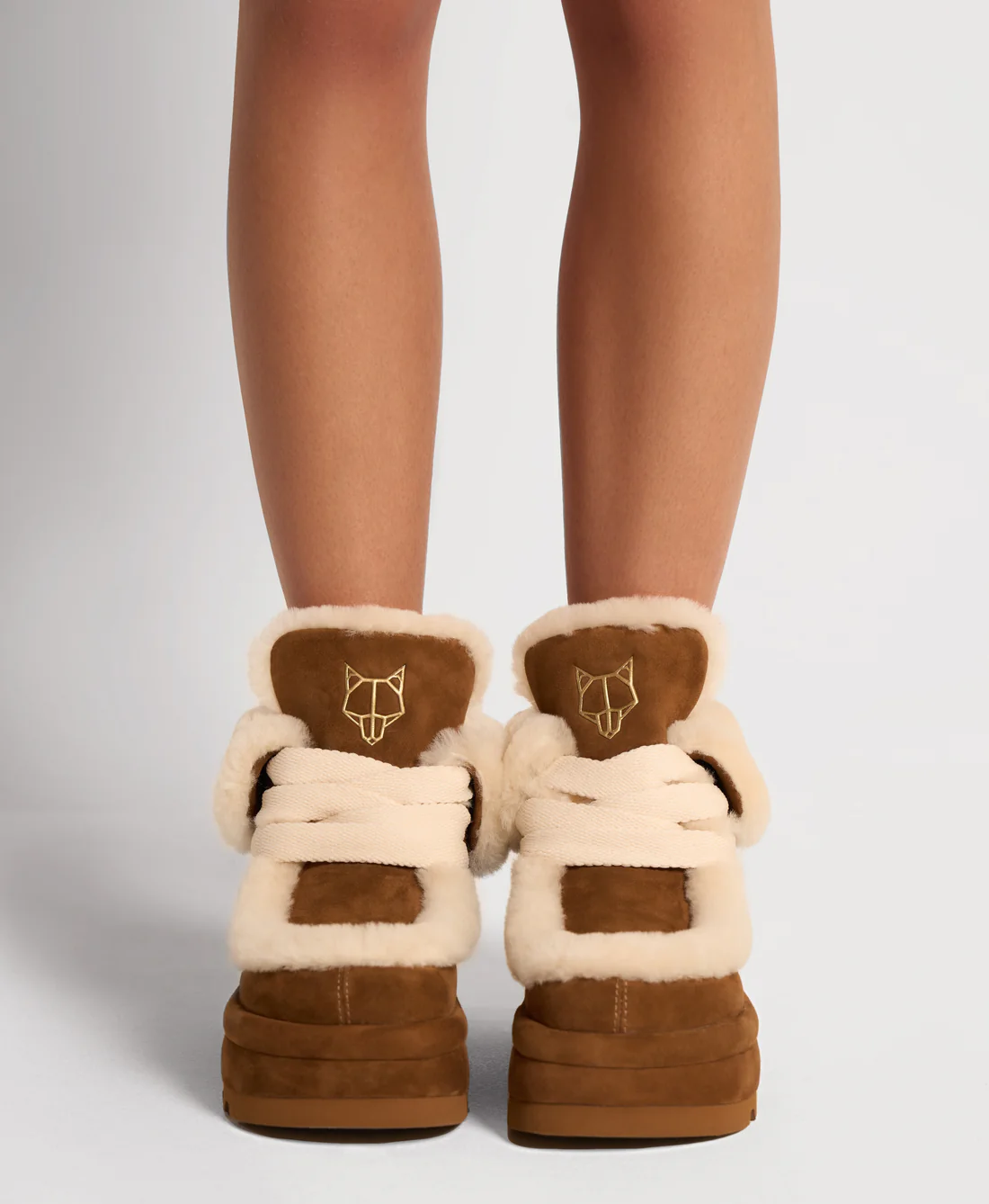 Bambi, the new boot from Naked Wolfe, a perfect blend of luxury and edge. This boot features a premium suede exterior and a warm shearling wool lining, ideal for colder weather. With a 60mm heel height and a chunky super light tread. The design is enhanced by 15mm width laces, an embossed Wolfe head on the tongue, and an embossed logo on the back tape. A small Wolfe head pin at the side adds a distinctive touch, making the Bambi boot a standout piece in any winter wardrobe.