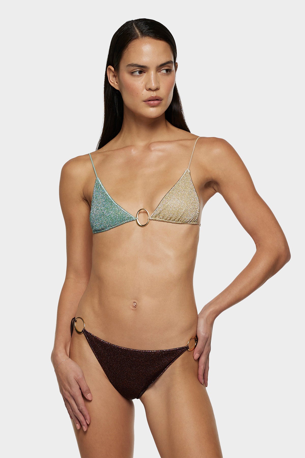 The Lumière O Kini channels Oséree’s playful elegance with its sleek silhouette and signature logo details. The shimmering fabric enhances every curve, while the bold ring accents add a touch of modern sensuality. A statement bikini made to shine from beach to sunset.