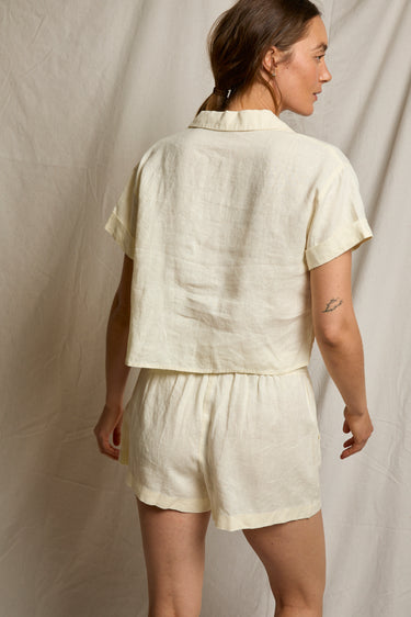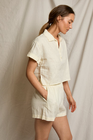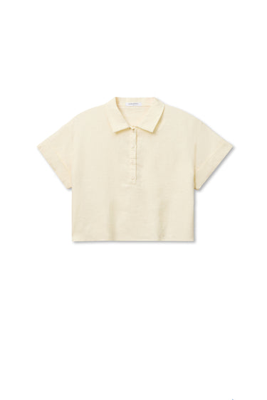 linen, but make it a polo. the tabitha is our answer to dressing in the heat. an airy, 100% linen top that trades the stuffiness of a traditional collared shirt for an open neckline and sharp boxy with a slightly cropped hem. It’s got that crisp texture that only gets better with sunshine.