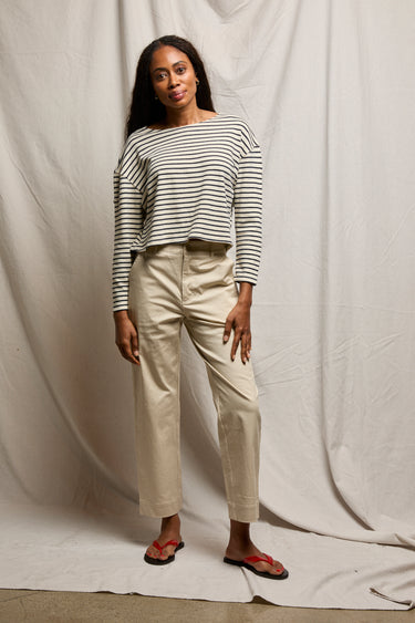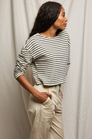 taylor brings those vintage rugby vibes into a long sleeve silhouette. we ditched the basic long sleeve for a wide boat neck and a boxy, structured frame that actually holds its shape. with those dropped shoulders and a clean, straight-cut hem, it’s the kind of piece that makes a "jeans and a tee" day look like a deliberate style choice.