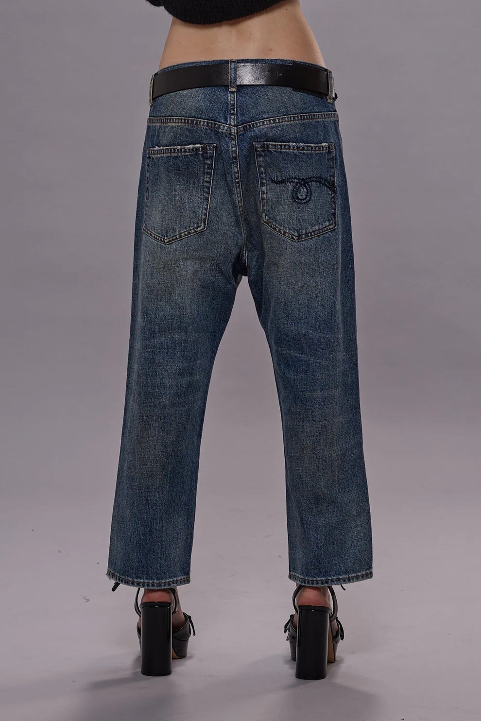R13's classic straight leg boyfriend jean. Built with Japanese rigid indigo denim (13.5 oz) and treated with a medium-dark indigo wash and a mild wear pattern.